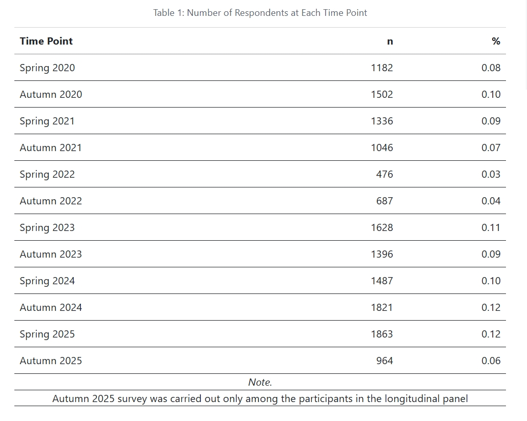 The results presented in this report are based on a teacher occupational well-being survey launched in Finland during the first spring of the COVID-19 pandemic in 2020. Since then, data collection has continued biannually, taking place at the end of both the spring and autumn terms.