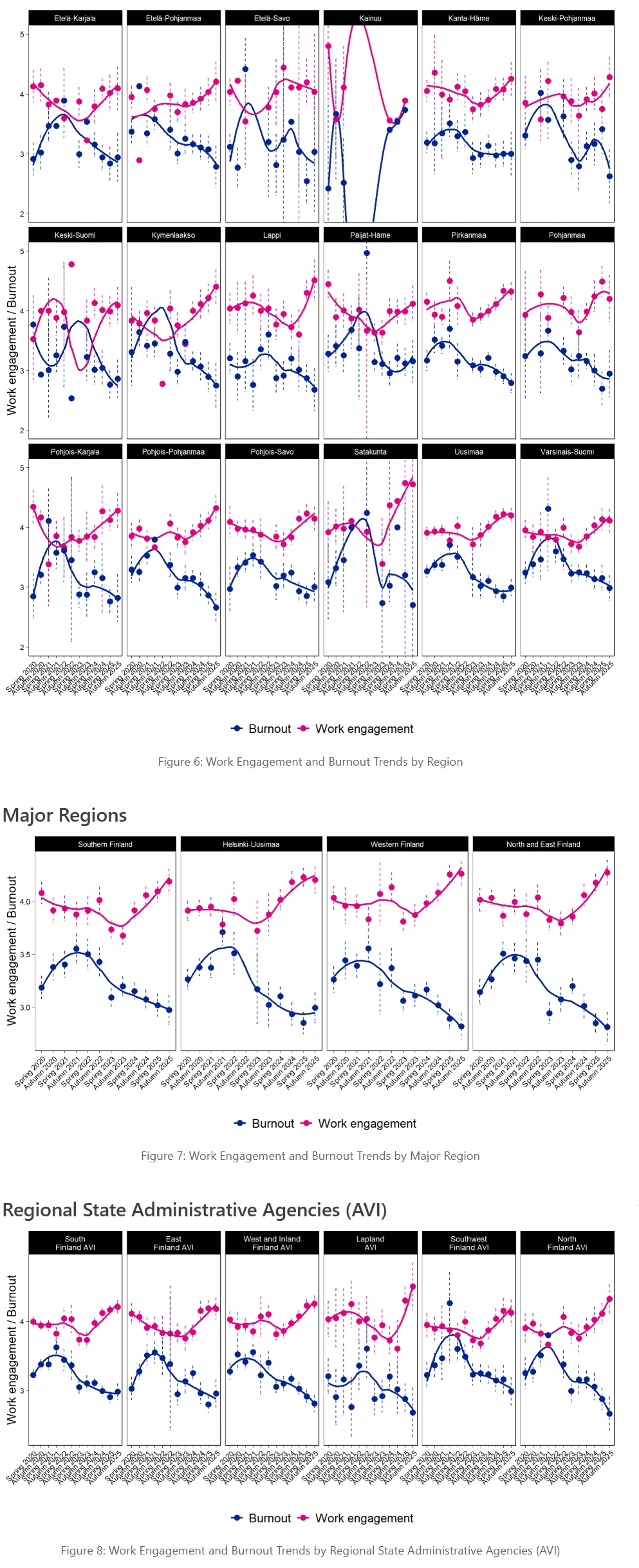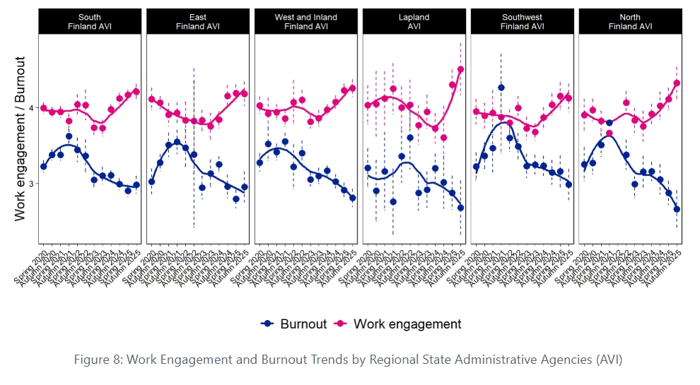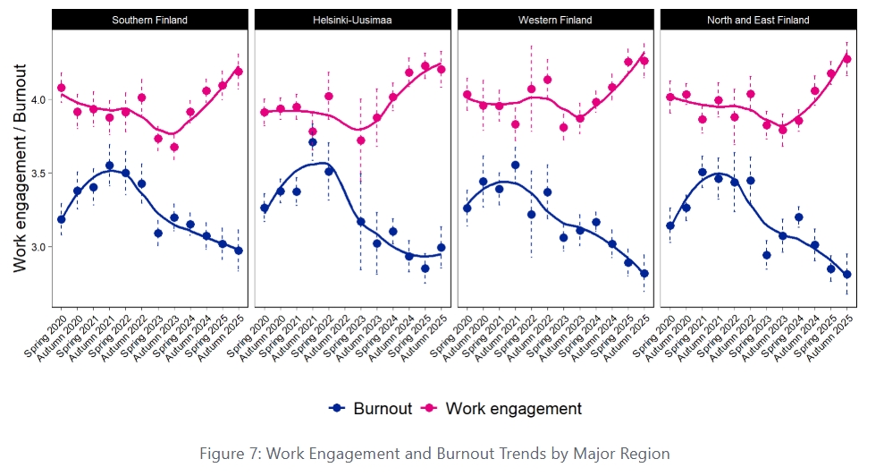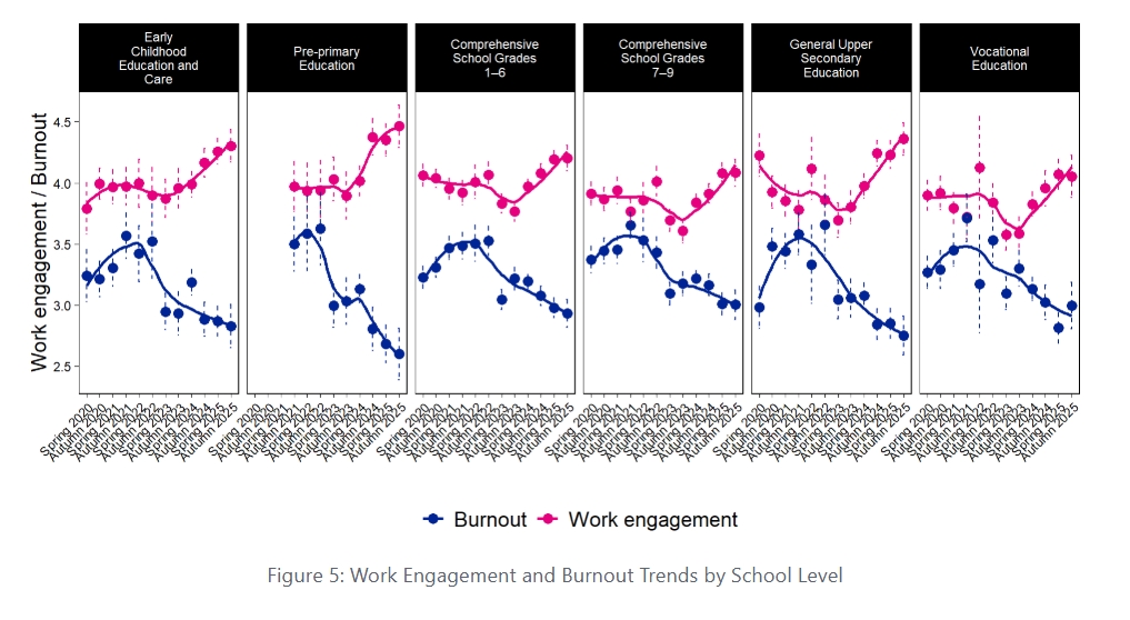 The results clearly reflect the impact of the early stages of the COVID-19 pandemic on teacher occupational well-being. The figure shows that teachers’ experiences of burnout increased steadily during 2020–2021, but have been on a downward trend—especially since spring 2023. This positive development is also visible in Figure 2, which breaks the results by burnout levels. In contrast, a clear upward trend in work engagement did not emerge until spring 2024, after which it has shown a consistent increase.