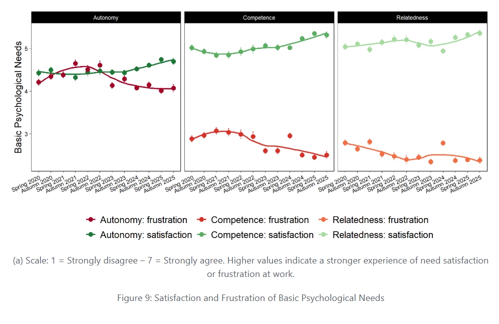 According to the results, teachers’ psychological need satisfaction has shown an increasing trend over the measurement period. Satisfaction related to competence and relatedness has generally been higher than satisfaction related to autonomy. Frustration concerning competence and relatedness has decreased over time and remained clearly lower than satisfaction throughout the observation period. The exception is frustration related to autonomy, which has remained relatively high over the entire measurement period. During the COVID-19 pandemic, particularly in 2021 and 2022, the level of autonomy frustration even exceeded that of satisfaction, but has since shown a notable decline.