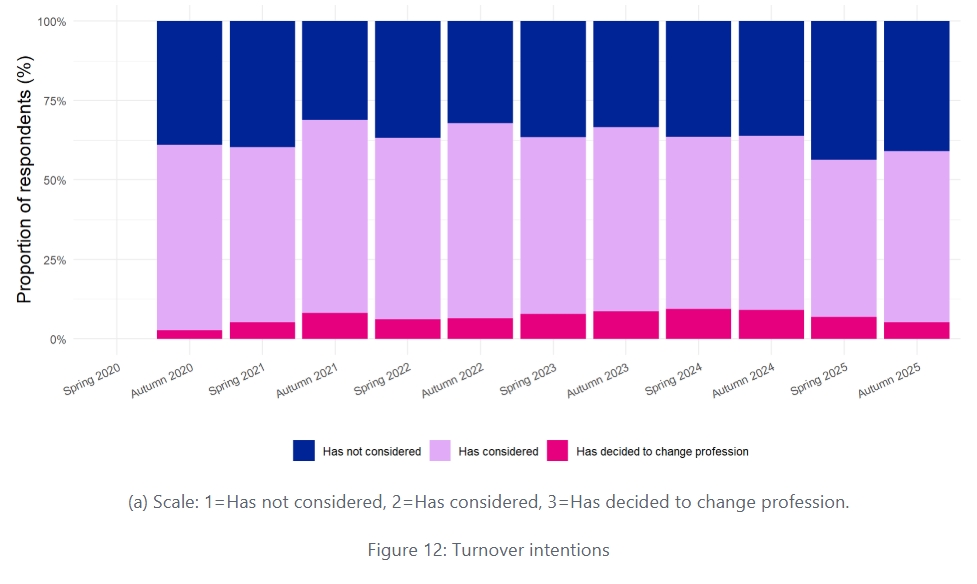 Turnover intentions offer an important perspective on teachers’ occupational well-being and the attractiveness of the entire profession. Based on the results, teachers’ turnover intentions have remained relatively stable throughout the study period. While many teachers report having considered leaving the profession, far fewer seem to have made a decision to do so.