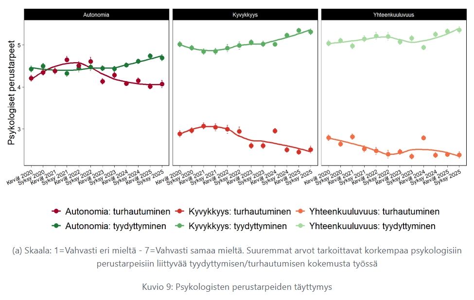 Tulosten perusteella opettajien psykologisten perustarpeiden tyydyttyminen on ollut mittausaikana nousevassa trendissä. Kokemus kyvykkyyden ja yhteenkuuluvuuden tyydyttymisestä on ollut keskimäärin korkeampaa kuin autonomian tyydyttyminen. Kyvykkyyteen ja yhteenkuuluvuuteen liittyvä turhautuminen on puolestaan laskenut ajan myötä ja ollut koko tarkastelujakson ajan selvästi tyydyttymistä matalammalla tasolla. Tästä poikkeuksen muodostaa autonomian turhautuminen, joka on pysynyt koko mittausjakson ajan verrattain korkealla. Koronapandemian aikana, erityisesti vuosina 2021 ja 2022, autonomian turhautumisen taso oli jopa korkeampi kuin tyydyttymisen, mutta tämän jälkeen se on kääntynyt selkeään laskuun.