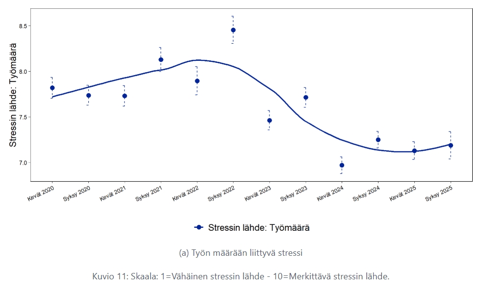 Tulosten perusteella työmäärään liittyvä stressi oli koholla koko koronapandemian ajan aina syksyyn 2022 saakka, minkä jälkeen siinä on havaittavissa laskusuunta.