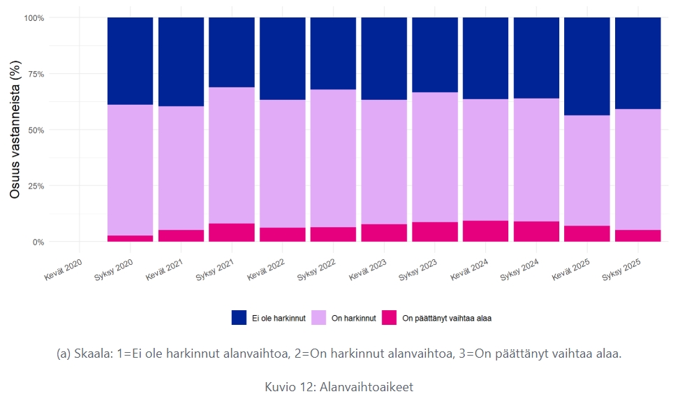 Alanvaihtoaikeet tarjoavat tärkeän näkökulman opettajien työhyvinvointiin sekä koko alan pitovoimaan. Tulosten perusteella opettajien alanvaihtoaikeet ovat pysyneet varsin stabiileina koko tutkimusjakson ajan. Vaikka suuri osa opettajista kertoo harkinneensa alanvaihtoa, huomattavasti harvempi näyttää tehneen varsinaisen päätöksen alan vaihtamisesta.