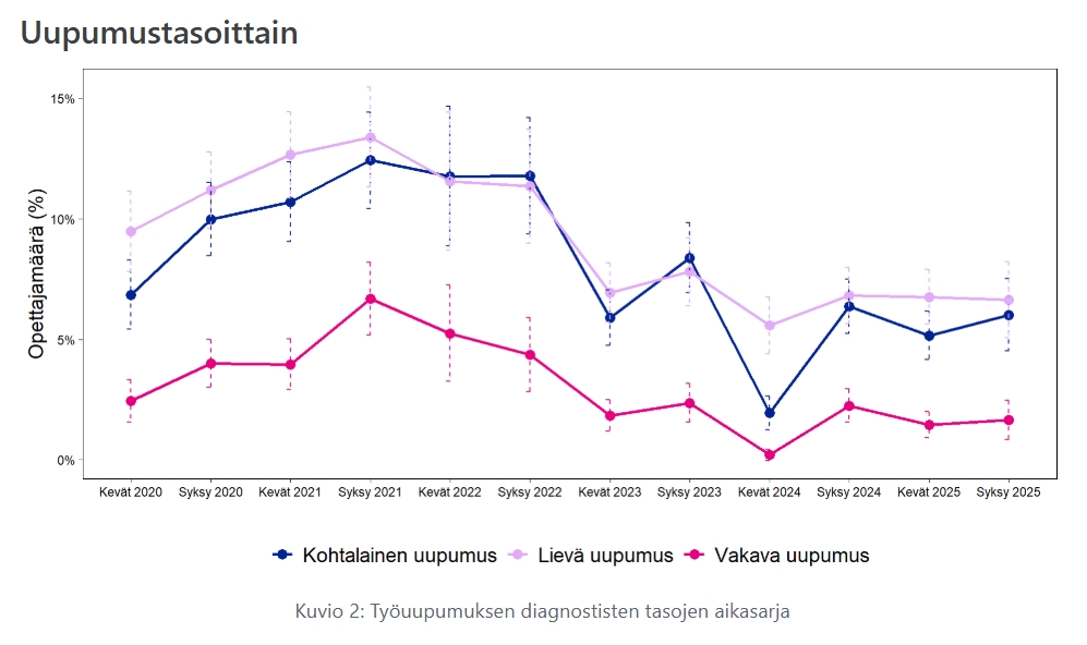 Tuloksissa näkyy selvästi koronapandemian alkuvaiheen vaikutus opettajien työhyvinvointiin. Kuviosta on nähtävillä, että opettajien kokema työuupumus lisääntyi tasaisesti vuosina 2020-2021, mutta on erityisesti keväästä 2023 alkaen ollut laskusuunnassa. Tämä myönteinen kehityssuunta näkyy myös Kuviossa 2, jossa työuupumusta koskevat tulokset on eritelty uupumustasoittain. Työn imun osalta sen sijaan havaittiin selkeä positiivinen trendi vasta keväällä 2024, josta alkaen työn imu on ollut tasaisesti nousussa.